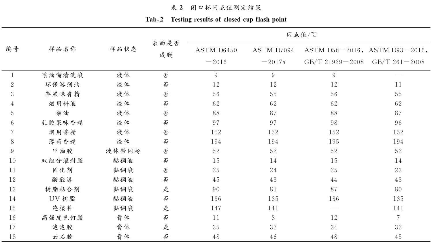 根據狀態及閃點范圍,選擇具有代表性的樣品作為研究對象。用不同的測試方法對同一樣品進行閉口杯閃點測定,測定結果見表2 。由表2可知,對于液體樣品,不同的測試方法測定的閉口杯閃點值基本一致,最大差值出現在乳酸果味香精樣品上。其他樣品使用不同測試方法測定的結果差值都不超過1℃ 。對于檢測過程中表面不成膜的黏稠液體樣品,測出的閃點值要小得多。對于膏體樣品,按照不同標準測定閃點值的情況與黏稠液體的情況相似。對采用不同測試方法測得的不同狀態樣品的閉口杯閃點值進行分析比較,可見在檢測過程中,測試時樣品用量只需1mL ,方法操作簡單快捷,且其測定的閃點值與其他測試方法的測定結果基本一致;測定表面不成膜的黏稠液體樣品,建議按照進行測試,該方法的樣品用量只需2mL ,且檢測過程中帶有攪拌子可使樣品受熱均勻;檢測表面不成膜的 膏 體 樣 品,由于其 對流傳熱慢 ,故按照上海昌吉SYD-5208D快速低溫閉口閃點試驗器使用升溫速率較慢的測試方法更加合適;對于表面成膜的樣品,為了避免檢測過程中試樣表面的膜阻擋易燃蒸汽的逸出而影響閃點值的檢測結果,則推薦采用在檢測過程中帶有攪拌功能的測試方法。